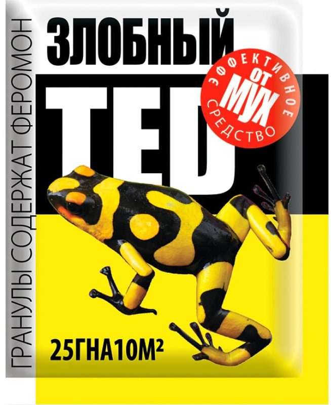Гранулы от мух «Злобный TED» с феромоном — это эффективное средство для борьбы с мухами в помещении. Они представляют собой пакетик весом 25 грамм, содержащий гранулы, обработанные специальным феромоном, который привлекает мух и уничтожает их.