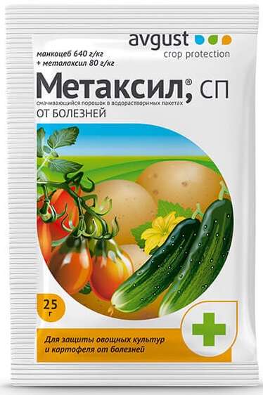 Спектр действия: Метаксил рекомендован для борьбы с болезнями, вызываемыми пероноспоровыми грибами, – фитофторозом картофеля и томатов, пероноспорозом огурцов и лука, милдью винограда.
