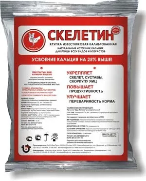 Основной компонент – калиброванная известняковая крупка. Для лучшего усвоения кальция организмом в состав премикса введены витамин D3 и марганец.Скелетин необходим птице для:
