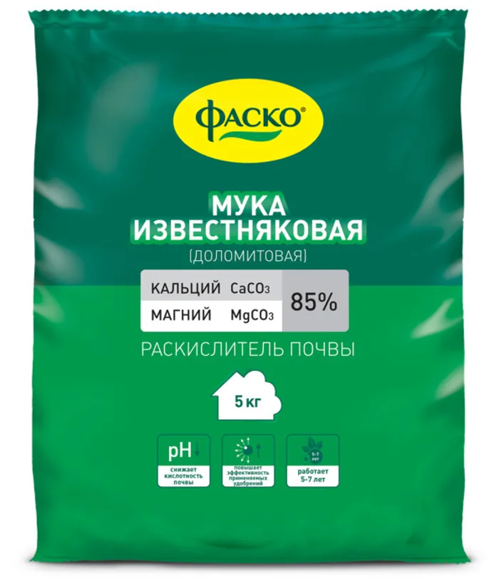 Раскислитель в виде известняковой (доломитовой) муки Фаско – специальное средство длительного действия для раскисления почвы. Подходит для использования как в открытых почвах, так и в теплицах или парниках. Использование такой смеси поможет вам увеличить урожайность моркови, картофеля, а также различных злаковых культур. Работая со смесью, соблюдайте меры предосторожности и технику безопасности.