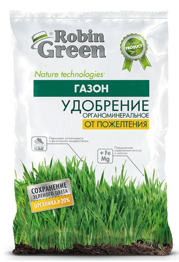 Удобрение сухое Робин Грин органоминеральное от пожелтения газона гранулированное является сбалансированной подкормкой, использующейся для газонов от пожелтения. Питательное удобрение сформировано в гранулу. Комплексная добавка отличается без хлорным составом, что благоприятно влияет на рост и развитие травы, а также вернет яркий и насыщенный цвет Вашему газону.