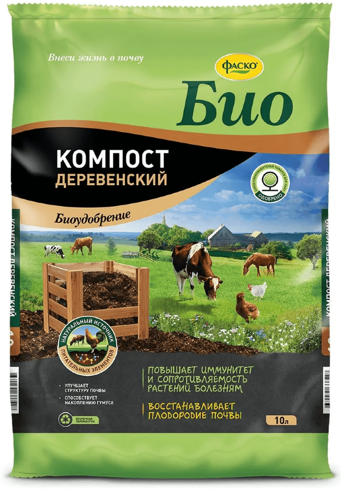 Главная страница » Каталог » Удобрение сухое Фаско БИО Компост Деревенский органоминеральное 10 л.  (Фаско) РФ