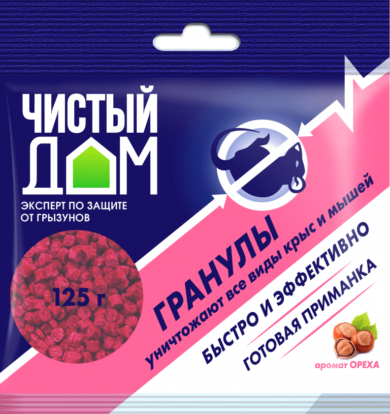 Гранулированная приманка, в состав которой входят натуральные продукты, действующее вещество и специальные добавки. Запах ореха создает высокую привлекательность для грызунов.