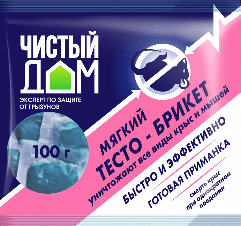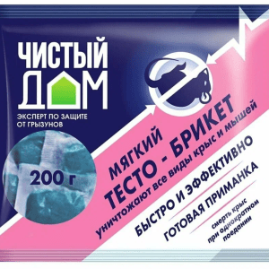 Тесто-брикет от крыс «Чистый дом» — универсальное средство для борьбы с разными видами грызунов. Представляет собой привлекательную для грызунов приманку, после однократного поедания которой они погибают.