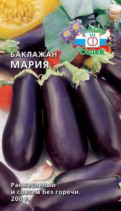 Ранний сорт семян баклажанов "Мария" для открытого грунта и тепличных укрытий. Период созревания от всходов до сбора урожая от 95 до 100 дней. Растение крепкое, среднерослое, слегка раскидистое. Плоды вытянутые, красивой и ровной формы, фиолетовые.