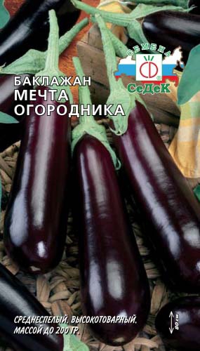 Ранний сорт семян баклажанов "Мечта Огородника" для открытого грунта и тепличных укрытий. Период созревания от всходов до сбора урожая от 95 до 105 дней. Растение мощное, очень высокое, раскидистое. Плоды ровные, красивой формы, черно-фиолетовые.