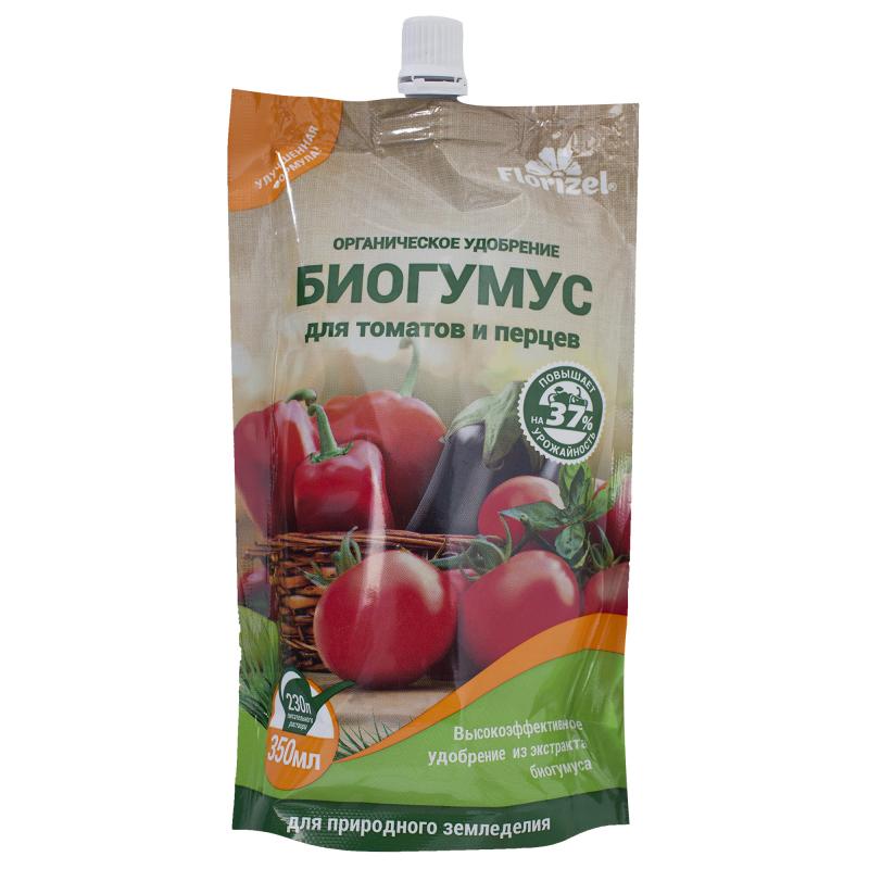 Биогумус — Florizel для томатов и перцев 350 мл. 1/20 шт. Удобрение применяется для корневой и внекорневой подкормки томатов, перцев, баклажанов и физалиса в открытом и защищённом грунте.