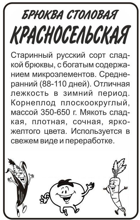 Старинный русский сорт сладкой брюквы, с богатым содержанием микроэлементов. Среднеранний (88-110 дней). Отличная лежкость в зимний период. Корнеплод плоскоокруглый, массой 350-650 г. Мякоть сладкая, плотная, сочная, ярко-желтого цвета. Используется в свежем виде и переработке. Холодостойка, неприхотлива, переувлажнение переносит плохо. Выращивается прямым посевом в грунт или через рассаду. На плодородной огородной грядке и при умеренном поливе растет прекрасно. Корнеплоды отлично хранятся.
