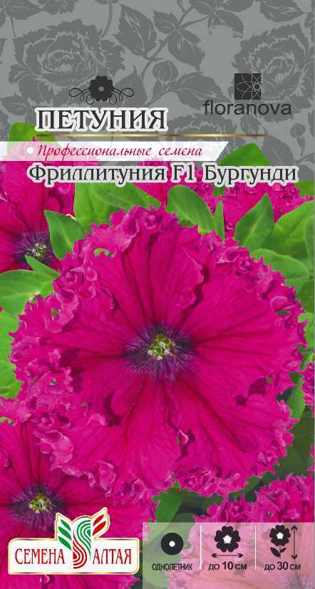 Эффектная петуния с уникальной формой цветка, отделанного «рюшами». В пору цветения представляет собой грандиозную картину – ее одинаковые по размеру компактные растения, высотой до 30 см, несут крупные гофрированные бордовые цветки, не теряющие декоративности в течение всего лета. Особенно привлекает коротким периодом выращивания, продолжительным цветением и выносливостью. Используется на клумбах в ярких групповых посадках, в бордюрах, рабатках, подвесных корзинах. Растение светолюбивое, хорошо растет на любых питательных почвах. Семена на рассаду сеют с конца февраля, их слегка вдавливают в грунт, не заделывая землей. Посевы увлажняют, накрывают стеклом и ставят в освещенное место. При температуре почвы +18-20°С всходы появляются на 14-20 день. Пока они мелкие, их лучше не поливать, а опрыскивать. Сеянцы пикируют в фазе 2-х настоящих листьев. В открытый грунт рассаду высаживают после окончания весенних заморозков.