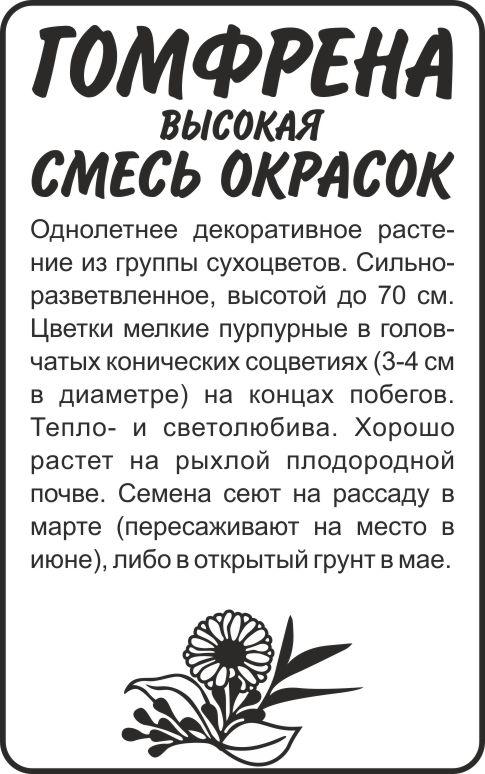 Главная страница » Каталог » Цветы Гомфрена Высокая Смесь окрасок/Сем Алт/бп 0,1 гр.
