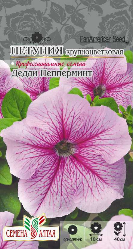 Один из самых раннецветущих однолетников, высота растений до 40 см. Отличается от других серий оригинальной окраской цветков – каждый имеет рисунок из четких прожилок, всегда более темных, чем основной цвет. Петуния Дедди Пепперминт имеет крупные цветки диаметром до 10 см необычайной нежно-розовой окраски с тонкой узорчатой сеточкой. Длительность и пышность цветения, устойчивость к непогоде — вот характеристики этого сорта. Отлично смотрится в кассетах, горшках, подвесных корзинах и на клумбах. Растение тепло- и светолюбиво, засухоустойчиво, предпочитает расти на солнечных открытых участках. К почвам нетребовательно. Семена на рассаду сеют в марте, их не заделывают землей, а просто накрывают ящики стеклом и содержат при температуре +20-240С, не допуская пересыхания оболочки гранулы. Пока всходы мелкие, их лучше не поливать, а опрыскивать. Посевы содержат при температуре не ниже +180С. В середине мая рассаду необходимо закалить, выставляя на открытый воздух. Высадка в открытый грунт проводится в июне.