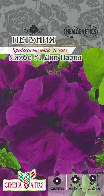 Петуния Лимбо – единственная на рынке генетически карликовая серия крупноцветковой петунии. Растение хорошо ветвится, не перерастает и не вытягивается в течение всего сезона. Не нуждается в регуляторах роста. Образует компактные кустики, покрытые крупными, до 12 см в диаметре, темно-пурпурными цветками. Растение очень быстро восстанавливается после дождя. Цветение наступает раньше, чем у других крупноцветковых петуний. Идеальный материал для декоративного оформления балконов, фасадов зданий, городских и садовых участков. Светолюбивое и достаточно засухоустойчивое растение, не переносит переувлажнения. Предпочитает легкие плодородные, хорошо дренированные почвы. Семена дражированные, что облегчает посев. В рассаде не перерастает, имеет очень хорошее ветвление. Семена высевают в феврале-марте, не заделывая землей, а просто накрывая ящики стеклом. Пока всходы мелкие, их лучше не поливать, а опрыскивать. На открытом воздухе продолжают выращивать с конца мая. Благодарно отзывается на поливы и регулярные подкормки
