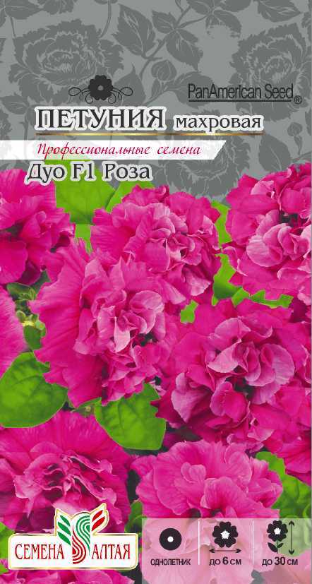 Многоцветковая петуния с очаровательным цветением! Кустики обильноцветущие ветвящиеся компактные, высотой около 30 см, усыпаны массой махровых насыщенно-розовых цветков с гофрированными лепестками. Растение устойчиво к похолоданиям и непогоде. Цветение пышное и длительное. Чудесно смотрится в балконных ящиках, цветниках, в групповых посадках на газоне. Широко используется для оформления городских и приусадебных участков. Семена на рассаду высевают в конце февраля — марте не заделывая землей, а просто накрывая ящики стеклом. Пока всходы мелкие их лучше не поливать, а опрыскивать. Пикировка в фазе 1-2 настоящих листочков. Высадка в грунт закаленной рассады в конце мая — начале июня, когда минует угроза заморозков. Спокойно переносят пересадку во взрослом состоянии. Возможно сохранение растений зимой в освещенном помещении при температуре около 12°С с предварительной обрезкой побегов.
