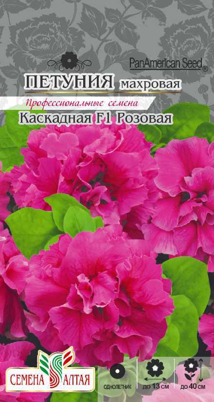 Восхитительные крупноцветковые петунии с интенсивным ростом, образующие ниспадающие побеги, покрытые во время цветения шлейфом цветков насыщенной розовой окраски. Цветение пышное и длительное. Чудесно смотрятся в балконных ящиках, цветниках, в групповых посадках на газоне, великолепное украшение крыльца, фасадов зданий и окон. Семена на рассаду высевают в конце февраля — марте не заделывая землей, а просто накрывая ящики стеклом. Пока всходы мелкие их лучше не поливать, а опрыскивать. Пикировка в фазе 1-2 настоящих листочков. Высадка в грунт закаленной рассады в конце мая — начале июня, когда минует угроза заморозков. Спокойно переносят пересадку во взрослом состоянии. Возможно сохранение растений зимой в освещенном помещении при температуре около 12°С с предварительной обрезкой побегов.