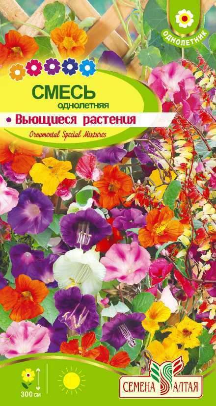 Смесь составлена из наиболее декоративных, популярных и неприхотливых однолетних вьющихся растений – настурций, душистых горошков, вьюнка, ипомеи, и пр. Отличается энергичным ростом и продолжительным цветением. Смесь используется для декорирования построек и изгородей, оплетения беседок и арок, создания в саду «зелёного объёма». Высевается прямым посевом в открытый грунт в мае. Всходы появляются на 10-14 день. Хорошо растет на солнце или в полутени. Предпочитает рыхлые, хорошо дренированные почвы.