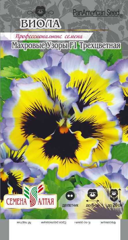 Уникальный сорт виолы с роскошными желтыми с голубой каймой и темным пятном в центре супер-гофрированными цветками. Растение формирует компактный ровный габитус, предпочитает легкую полутень и прохладу, которая усиливает гофрированность лепестков. Раннее цветение, выровненная форма куста и устойчивость к неблагоприятным погодным условиям делают виолу серии Махровые Узоры незаменимой при оформлении контейнеров, вазонов. Прекрасно подойдет для выращивания на клумбах, бордюрах и альпийских горках. Для получения растений, цветущих в год посева, семена на рассаду высевают в феврале-начале марта. Семена слегка присыпают землей, всходы появляются на 5-7 день. В грунт рассаду высаживают в конце мая-июне. При выращивании как двулетника семена на рассаду высевают в мае-июле на разводочные гряды. Всходы появляются через 2-3 недели. В конце августа — начале сентября их высаживают на постоянное место. Необходимы подкормки комплексными минеральными удобрениями. Цветение при выращивании рассадой с июля до заморозков.