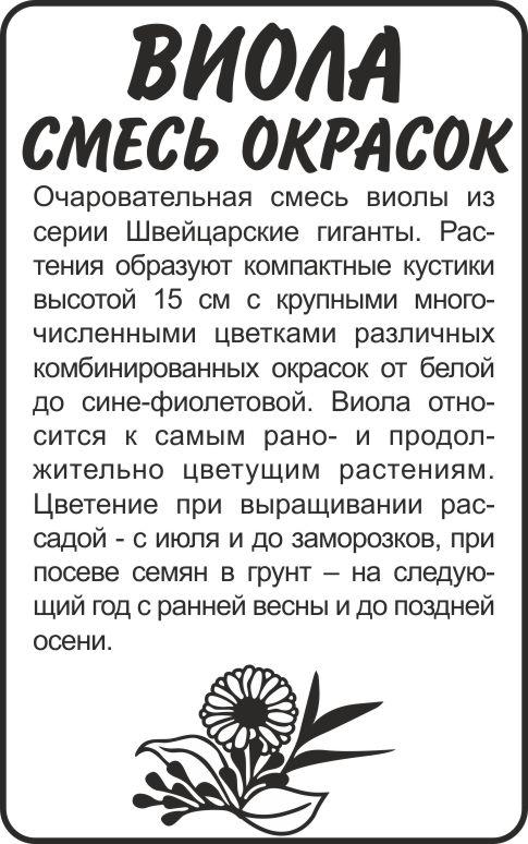 Очаровательная смесь виолы из серии Швейцарские гиганты. Растения образуют компактные кустики высотой 15 см с крупными многочисленными цветками различных комбинированных окрасок от белой до сине-фиолетовой. Виола относится к самым рано- и продолжительно цветущим растениям. При выращивании как двулетника семена на рассаду высевают в мае-июле на разводочные гряды. Всходы появляются через 2-3 недели. В конце августа — начале сентября их высаживают на постоянное место. Для получения растений, цветущих в год посева, семена на рассаду высевают в декабре — январе. В грунт рассаду высаживают в мае. Цветение при выращивании рассадой с июля и до заморозков, при посеве семян в грунт – на следующий год с ранней весны и до поздней осени.