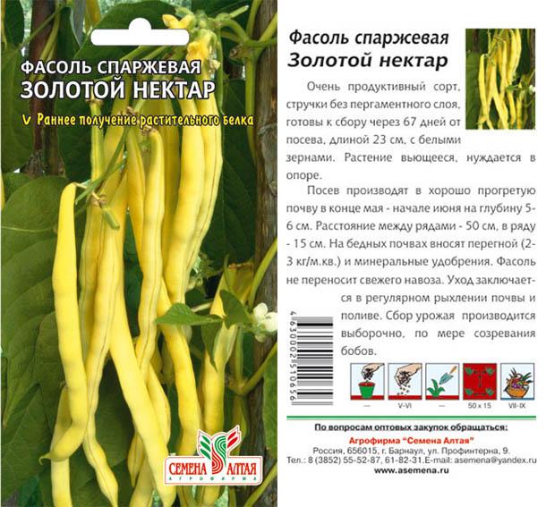Скороспелый (67-70 дней) высокоурожайный сорт. Растение мощное, вьющееся, высотой до 4 м, нуждается в опоре. Стручки без пергаментного слоя, длиной 20-25 см. золотисто-желтого цвета, с белыми зернами. Используется для приготовления разнообразных блюд, для заморозки и консервировании. Посев производят в хорошо прогретую почву в конце мая — начале июня на глубину 5-6 см. Расстояние между рядами 50 см, в рядах —15 см. На бедных почвах вносят перегной (2-3 кг/кв.м) и минеральные удобрения. Фасоль не переносит свежего навоза. Уход заключается в регулярном рыхлении почвы и поливе. Сбор урожая производится выборочно, по мере созревания бобов.