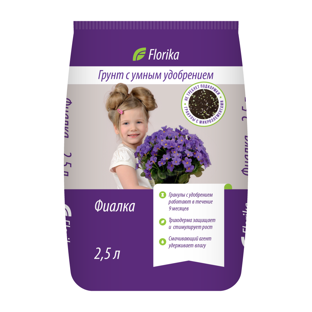 Плодородный грунт на основе верхового и низинного торфа, агроперлита, доломитовой (известняковой) муки, удобрения пролонгированного действия, смачивающего агента и гриба триходерма, для выращивания сенполий, глоксиний и бегоний.