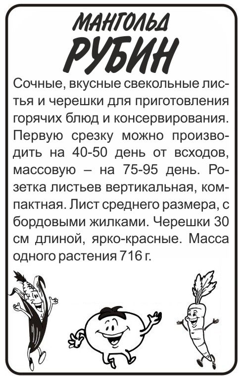 Сочные, вкусные свекольные листья и черешки для приготовления горячих блюд и консервирования. Первую срезку можно производить на 40-50 день от всходов, массовую – на 75-95 день. Розетка листьев вертикальная, компактная. Лист среднего размера, с бордовыми жилками. Черешки 30 см длиной, ярко-красные. Масса одного растения 716 г. Мангольд выращивают через рассаду, что позволяет получить урожай на 2-3 недели раньше или посевом в грунт. Выращивают по схеме: 30-40 х 40-50 см. Уборку мангольда начинают при образовании 5-7 листьев, путем их частичного удаления, что позволяет получать урожай в течение всего лета. Корни мангольда пригодны для выгонки в зимний период.