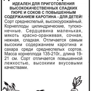 Сорт для любителей сочной и сладкой моркови! Среднего срока созревания (100-115 дней), с крупной розеткой листьев, сортотип Нантская. Корнеплоды цилиндрические, тупоконечные, длиной 20-22 см, с гладкой поверхностью, массой 90-140 г. Окраска оранжево-красная, благодаря высокому содержанию каротина, мякоть сочная, сладкая, с небольшой сердцевиной. Хорошо растёт на освещённых участках с рыхлой плодородной супесчаной или легкосуглинистой почвой с глубоким пахотным слоем. Плохо переносит затенение. Не выносит свежего навоза: при его внесении образует искривлённые, с множеством корней кор-неплоды. Морковь потребляет мало азота, поэтому её возделывают при умеренном азотном и обильном калийно-фосфорном питании. Лучшие предшественники — картофель, капуста, огурец, томат, лук.