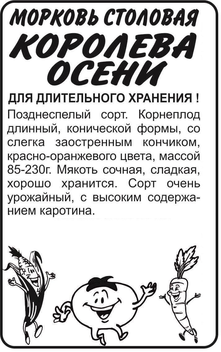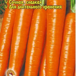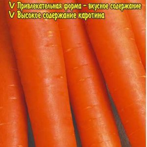 Позднеспелый сорт. Корнеплод длинный, конической формы, со слегка заостренным кончиком, красно-оранжевого цвета, массой 85-230 г, хорошо хранится. Сорт очень урожайный, с высоким содержанием каротина. Хорошо растёт на освещённых участках с рыхлой плодородной супесчаной или легкосуглинистой почвой с глубоким пахотным слоем. Плохо переносит затенение. Не выносит свежего навоза: при его внесении образует искривлённые, с множеством корней кор-неплоды. Морковь потребляет мало азота, поэтому её возделывают при умеренном азотном и обильном калийно-фосфорном питании. Лучшие предшественники — картофель, капуста, огурец, томат, лук.