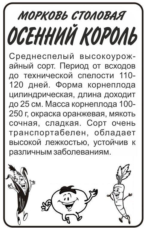 Среднеспелый высокоурожайный сорт. Период от всходов до технической спелости 110-120 дней. Форма корнеплода цилиндрическая, длина доходит до 25 см. Масса корнеплода 100-250 г, окраска оранжевая, мякоть сочная, сладкая. Сорт очень транспортабелен, обладает высокой лежкостью, устойчив к различным заболеваниям. Хорошо растёт на освещённых участках с рыхлой плодородной супесчаной или легкосуглинистой почвой с глубоким пахотным слоем. Плохо переносит затенение. Не выносит свежего навоза: при его внесении образует искривлённые, с множеством корней кор-неплоды. Морковь потребляет мало азота, поэтому её возделывают при умеренном азотном и обильном калийно-фосфорном питании. Лучшие предшественники — картофель, капуста, огурец, томат, лук.