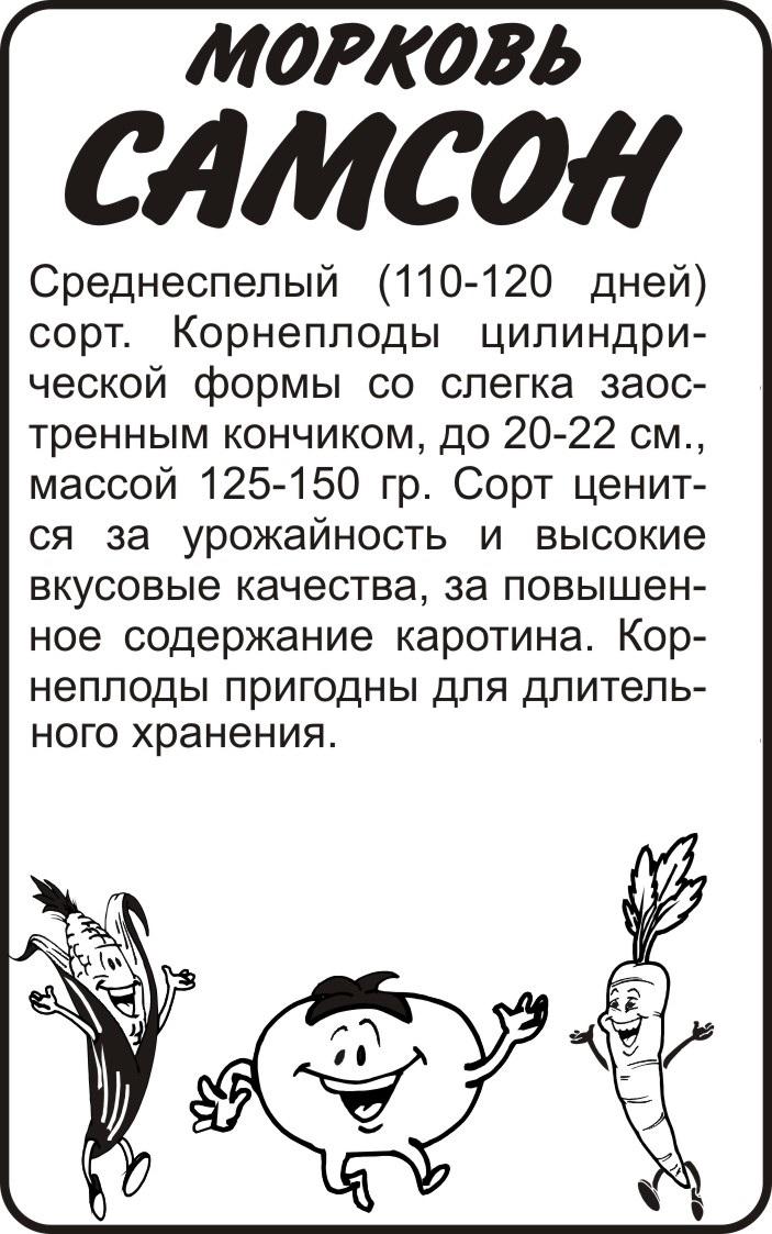 Среднеспелый (110-120 дней) сорт. Корнеплоды цилиндрической формы со слегка заостренным кончиком, до 20-22 см, массой 125-150 г. Сорт ценится за урожайность и высокие вкусовые качества, за повышенное содержание каротина. Корнеплоды пригодны для длительного хранения. Хорошо растёт на освещённых участках с рыхлой плодородной супесчаной или легкосуглинистой почвой с глубоким пахотным слоем. Плохо переносит затенение. Не выносит свежего навоза: при его внесении образует искривлённые, с множеством корней кор-неплоды. Морковь потребляет мало азота, поэтому её возделывают при умеренном азотном и обильном калийно-фосфорном питании. Лучшие предшественники — картофель, капуста, огурец, томат, лук.