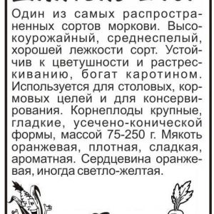 Среднеспелый, лежкий сорт. Корнеплоды конические, оранжево-красные. длиной 15-17 см, массой 100-180 г. Вкусовые качества хорошие. Рекомендуется для употребления в свежем виде и переработки. Отличная транспортабельность.