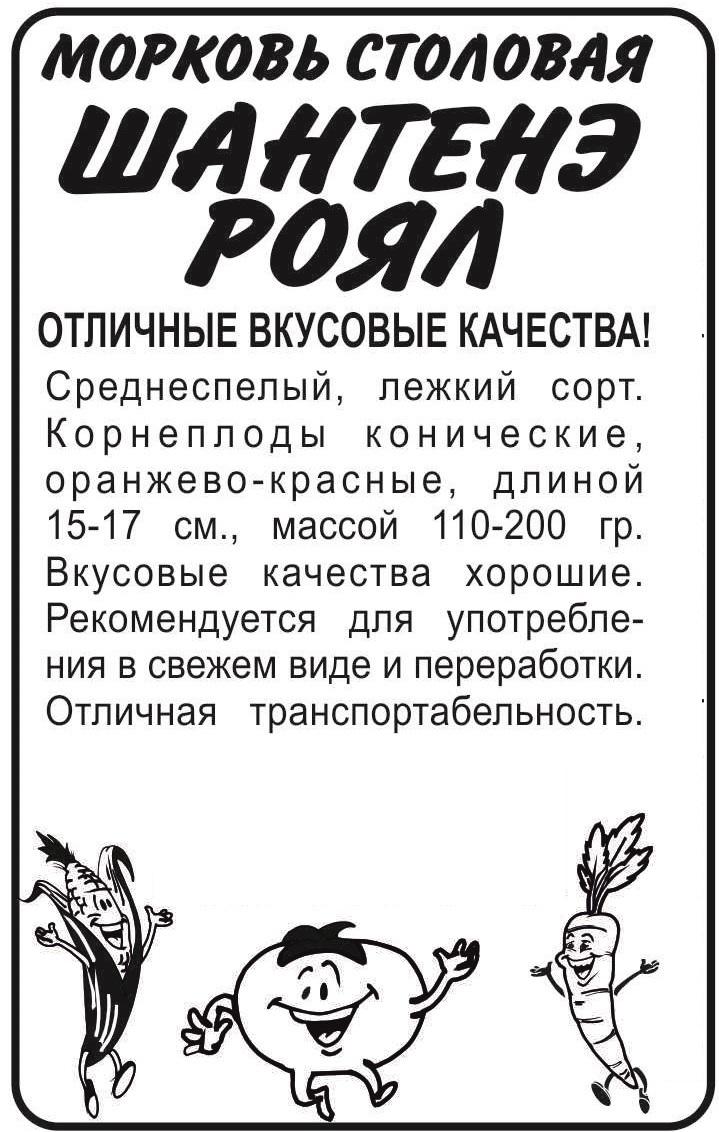 Среднеспелый, лежкий сорт. Корнеплоды конические, оранжево-красные, длиной 15-17 см, массой 110-200 г. Вкусовые качества хорошие. Рекомендуется для употребления в свежем виде и переработки. Отличная транспортабельность. Хорошо растёт на освещённых участках с рыхлой плодородной супесчаной или легкосуглинистой почвой с глубоким пахотным слоем. Плохо переносит затенение. Не выносит свежего навоза: при его внесении образует искривлённые, с множеством корней кор-неплоды. Морковь потребляет мало азота, поэтому её возделывают при умеренном азотном и обильном калийно-фосфорном питании. Лучшие предшественники — картофель, капуста, огурец, томат, лук.