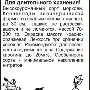 Сорт среднеспелый (78-120 дней). Корнеплод цилиндрический, с тупым кончиком, длиной 15-20 см, масса 96-170 г. Сорт рекомендуется для получения ранней продукции, для производства детского и диетического питания. Хорошее хранение в зимний период. Хорошо растёт на освещённых участках с рыхлой плодородной супесчаной или легкосуглинистой почвой с глубоким пахотным слоем. Плохо переносит затенение. Не выносит свежего навоза: при его внесении образует искривлённые, с множеством корней кор-неплоды. Морковь потребляет мало азота, поэтому её возделывают при умеренном азотном и обильном калийно-фосфорном питании. Лучшие предшественники — картофель, капуста, огурец, томат, лук.