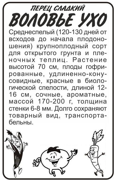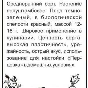 Среднеспелый (120-130 дней от всходов до начала плодоношения) крупноплодный сорт для открытого грунта и пленочных теплиц. Растение высотой 70 см, плоды гофрированные, удлиненно-конусовидные, красные в биологической спелости, длиной 12-16 см, сочные, ароматные, массой 170-200 г, толщина стенки 6-8 мм. Долго сохраняют товарный вид, транспортабельны. Можно выращивать после моркови, капусты, свеклы, бобовых (кроме фасоли) и тыквенных культур. Перец нельзя размещать рядом с огурцом. Выращивается рассадным способом. Для полу-чения рассады семена высевают в феврале в посевные ящики с почвенной смесью. Ящики, накрытые пленкой (стеклом), помещают в теплое место. Оптимальная температура для прорастания семян 23-25°С. В открытый грунт высаживают в начале июня.