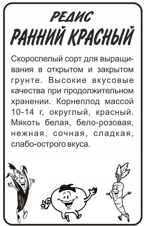 Скороспелый сорт для выращивания в открытом и закрытом грунте. Высокие вкусовые качества при продолжительном хранении. Корнеплод массой 10-14 г, округлый, красный. Мякоть белая, бело-розовая, нежная, сочная, сладкая, слабо-острого вкуса. Под выращивание редиса отводят рыхлые, плодородные, супес-чаные или легкосуглинистые почвы. На бедных, тяжелых и кислых почвах хороший урожай высокого качества не вырастает. Редис требователен к свету, в тени дает длинную ботву и маленький корнеплод. Для получения максимального урожая редиса необходимо строгое соблюдение севооборота — не сажать его после крестоцветных. Возможны смешанные посевы редиса с морковью и луком. Посев проводят с начала апреля до середины августа. Семена всходят при температуре 16-18°C на 5-6 день.