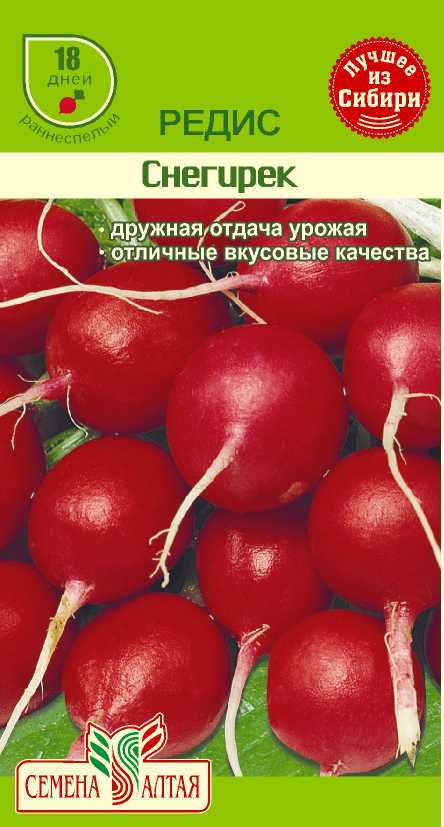 Раннеспелый сорт. Корнеплод округлый, красный, массой 20 г. Мякоть стекловидная, вкусовые качества отличные. Ценность сорта: высокая урожайность, дружная отдача урожая. Под выращивание редиса отводят рыхлые, плодородные, супес-чаные или легкосуглинистые почвы. На бедных, тяжелых и кислых почвах хороший урожай высокого качества не вырастает. Редис требователен к свету, в тени дает длинную ботву и маленький корнеплод. Для получения максимального урожая редиса необходимо строгое соблюдение севооборота — не сажать его после крестоцветных. Возможны смешанные посевы редиса с морковью и луком. Посев проводят с начала апреля до середины августа. Семена всходят при температуре 16-18°C на 5-6 день.