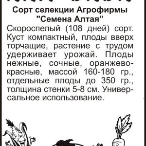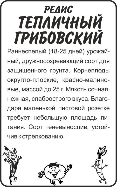 Раннеспелый (18-25 дней) урожайный, дружносозревающий сорт для защищенного грунта. Корнеплоды округло-плоские, красно-малиновые, массой до 25 г. Мякоть сочная, нежная, слабоострого вкуса. Благодаря маленькой листовой розетке требует небольшую площадь питании. Сорт теневынослив, устойчив к стрелкованию. Под выращивание редиса отводят рыхлые, плодородные, супесчаные или легкосуглинистые почвы. На бедных, тяжелых и кислых почвах хороший урожай высокого качества не вырастает. Редис требователен к свету, в тени дает длинную ботву и маленький корнеплод. Для получения максимального урожая редиса необходимо строгое соблюдение севооборота — не сажать его после крестоцветных. Возможны смешанные посевы редиса с морковью и луком. Посев проводят с начала апреля до середины августа. Семена всходят при температуре 16-18°C на 5-6 день.
