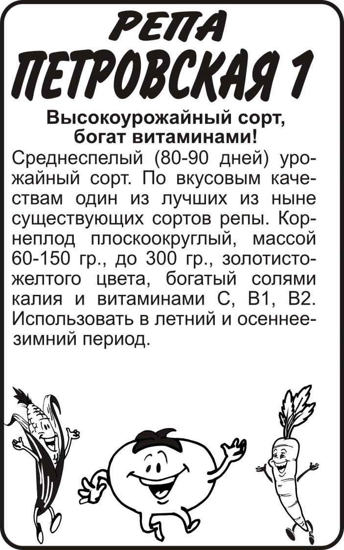 Среднеспелый (80-90 дней) урожайный сорт. По вкусовым качествам один из лучших ныне существующих сортов репы. Корнеплод плоскоокруглый, массой 60-150 г до 300 г золотисто-желтого цвета, богатый солями калия и витаминами С, B1, B2. Использовать в летний и осенне-зимний период. Лучше растет на плодородных, хорошо обработанных почвах, супесчаных или легкосуглинистых, с нейтральной и слабокислой реакцией. Свежего навоза не переносит. Размещают после овощных культур, кроме крестоцветных. Для летнего потребления семена высевают в грунт с конца апреля до конца мая, а для закладки на хранение с конца июня до середины июля. Семена заделывают на глубину 1,0-1,5 см.