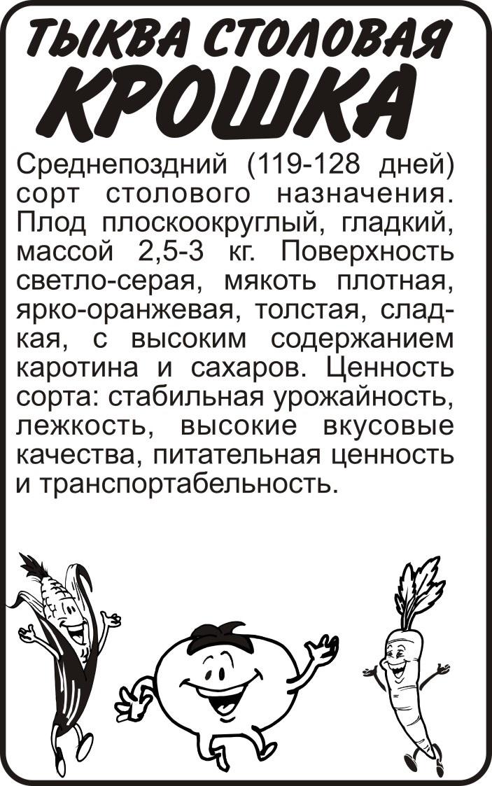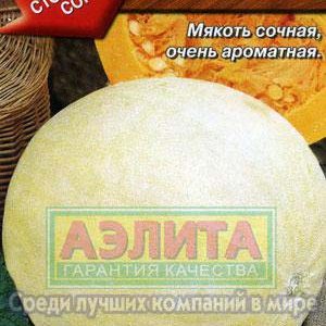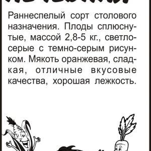Среднепоздний сорт, от всходов до технической спелости 119-128 дней. Плоды плоскоокруглые. Поверхность светло-серая. Мякоть плотная, ярко-оранжевая, сочная, сладкая с высоким содержанием каротина, сахаров. Плоды 2,5-3 кг, хорошей лежкости и транспортабельности. Требовательна к плодородию почвы и освещению. Лучшие почвы — супесчаные и легкосуглинистые, слабокислые или нейтральные, с глубоким пахотным слоем. Отзывчива на внесение перегноя. Семена высевают в открытый грунт по 2-3 штуки в лунку, когда минует угроза заморозков. Глубина заделки семян 3-5 см, на легких почвах до 7 см. Для нормального вызревания на растении оставляют по 2-4 завязи, а плети прищипывают. Плоды убирают в полной спелости вместе с плодоножкой.