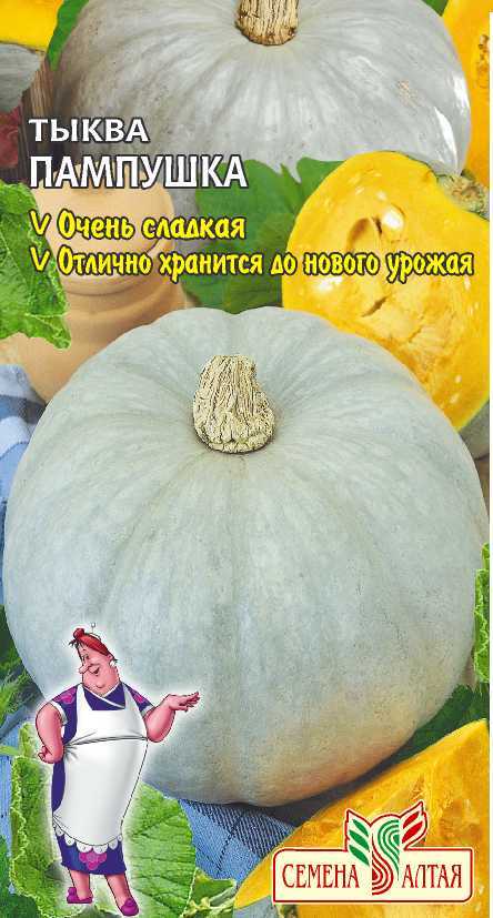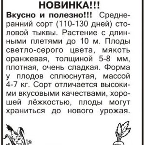 Вкусно и полезно! Среднеранний сорт (110-130 дней) столовой тыквы. Растения с длинными плетями до 10 м. Плоды светло-серого цвета, массой 4-7 кг, мякоть оранжевая, толщиной 5-8 см, плотная, очень сладкая. Форма плодов сплюснутая. Сорт отличается высокими вкусовыми качествами, хорошей лежкостью, плоды могут храниться до нового урожая. Требовательна к плодородию почвы и освещению. Лучшие почвы — супесчаные и легкосуглинистые, слабокислые или нейтральные, с глубоким пахотным слоем. Отзывчива на внесение перегноя. Семена высевают в открытый грунт по 2-3 штуки в лунку, когда минует угроза заморозков. Глубина заделки семян 3-5 см, на легких почвах до 7 см. Для нормального вызревания на растении оставляют по 2-4 завязи, а плети прищипывают. Плоды убирают в полной спелости вместе с плодоножкой.