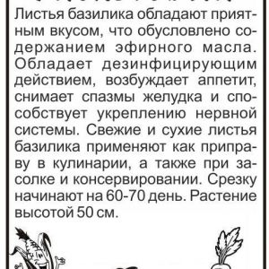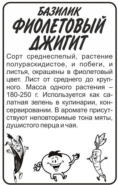 Сорт среднеспелый, растение полураскидистое, и побеги, и листья, окрашены в фиолетовый цвет. Лист от среднего до крупного. Масса одного растения – 180-250 г. Используется как салатная зелень в кулинарии, консервировании. В аромате присутствуют неповторимые тона мяты, душистого перца и чая. Хорошо растет на легких, богатых перегноем почвах. Свето- и теп-лолюбив. Возможно выращивание рассадным и безрассадным спосо-бами. Рассаду в открытый грунт высаживают в конце мая — начале июня. При посеве семян в открытый грунт в конце мая можно получить только зелень, но не семена. При перекопке осенью вносят перегной или компост, весной перед посевом — комплексные минеральные удобрения. Сбор урожая проводится выборочно, по мере формирования зеленой массы.
